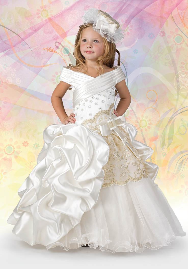 Детское нарядное платье А-силуэта. Корсет украшает драпировка и элементы золотого кружева, пышная юбка с драпировками и оборками. Данная модель выполнена в бежевом цвете.
