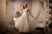 Легкое летящее платье греческого стиля изготовлено из тонкого атласа и шифона.Лиф и плечи покрыты гипюром шантилье.Эффектный вырез на груди украшает брошь вышитая бисером и стразами Swarovsky.Корсет укреплен риглином(корсетная фурнитура),бюстье и фиксирующей резинкой под грудью.Застежка молния и шнуровка.