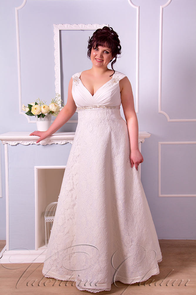 Свадебное платье А-силуэта.Драпировка из шифона по лифу платья переходит в бретель.и украшена так же как и под грудью вышивкой бисером,пайеткой и жемчугом.Юбка в пол,расклешенная к низу из плотного атласа и покрыта кордовым гипюром .Корсет укреплен риглином(корсетная фурнитура),бюстье .Застежка молния и фиксирующая шнуровка.