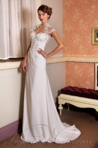 Коктельное платье изготовлено из тонкого атласа и стрейч-фатина.Модель задрапирована по силуэту платья веерными складами.Лиф платья украшен аппликациями,расшитыми бисером и пайеткой.Корсет укреплен риглином(корсетная фурнитура),бюстье и фиксирующей резинкой под грудью.Застежка молния.