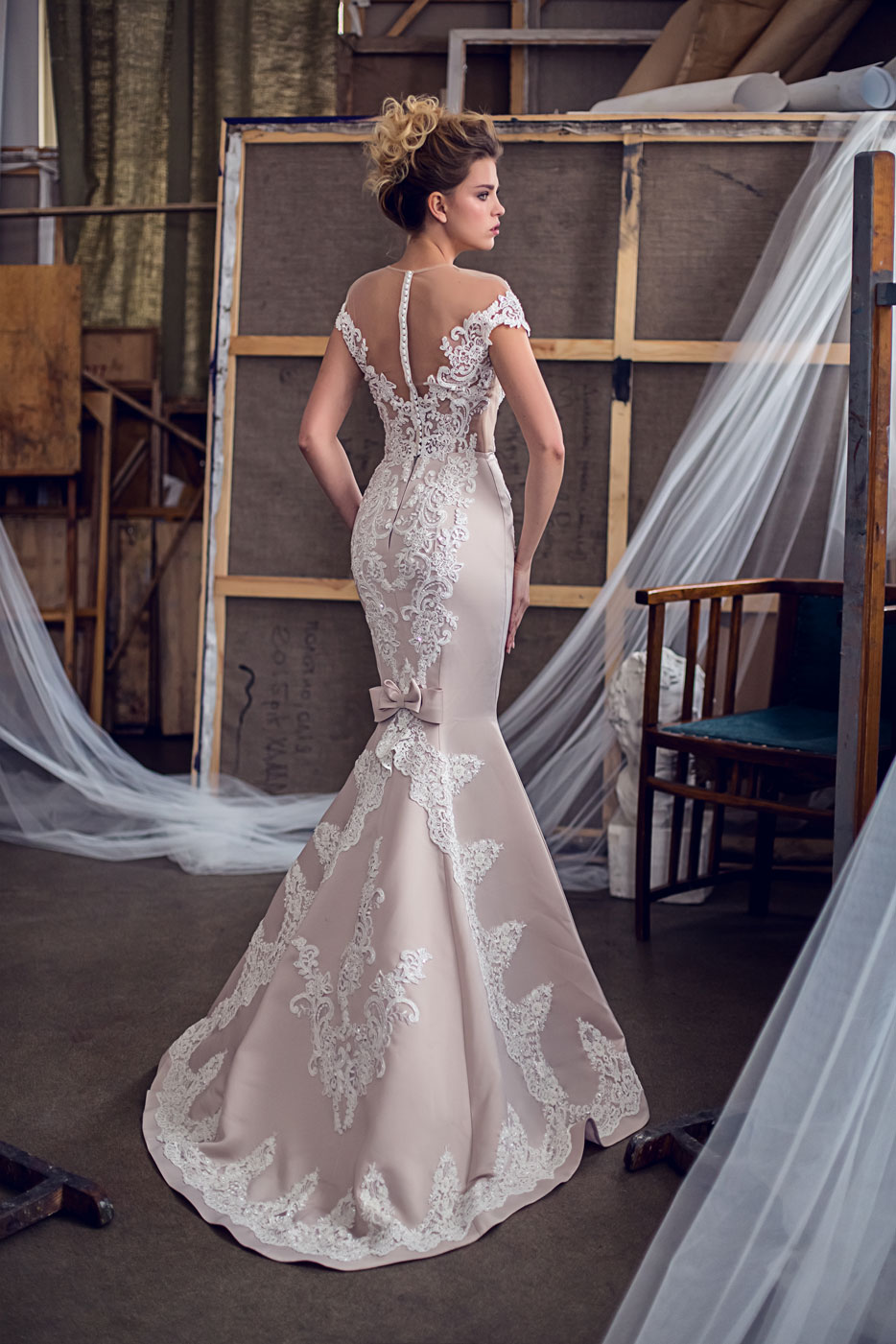 Силуэт платья украшен французским гипюром. Низ украшает французское сутажное кружево. Застежка на воздушные петли и мелкие пуговицы по спинке, "молнию" - по юбке. Дополняет модель эффектно украшенный кружевной шлейф.