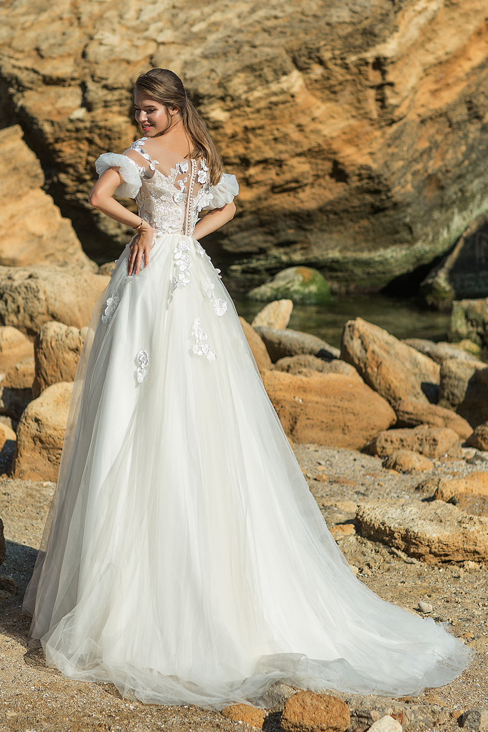 Роскошное свадебное платье А-силуэта изготовлено из евро-фатина и сатина. Корсет укреплен риглином (корсетная фурнитура) и выстроченным бюстье. Лиф и спинку украшает кружево с 3D цветами, которые отдельными элементами переходят на юбку. По спинке потайная шнуровка и ряд пуговиц с воздушными петлями. Объем юбке придают многослойные подъюбники из жёсткого фатина, давая возможность невесте не надевать кринолин. Изюминка модели – рукава «фонарики» и небольшой шлейф.