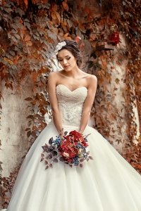 Нежное вечернее платье А-силуэта с открытыми плечами и длинным рукавом выполнено из мерцающего стрейч-сатина и евро-фатина контрастного цвета. Корсет и рукава украшены 3D-цветами и объемной вышивкой из бисера и бусин. Юбка – полусолнце. Застежка – потайная молния по юбке и спинке, небольшая шнуровка по спинке. Дополняет модель расшивка ручной работы и шлейф.