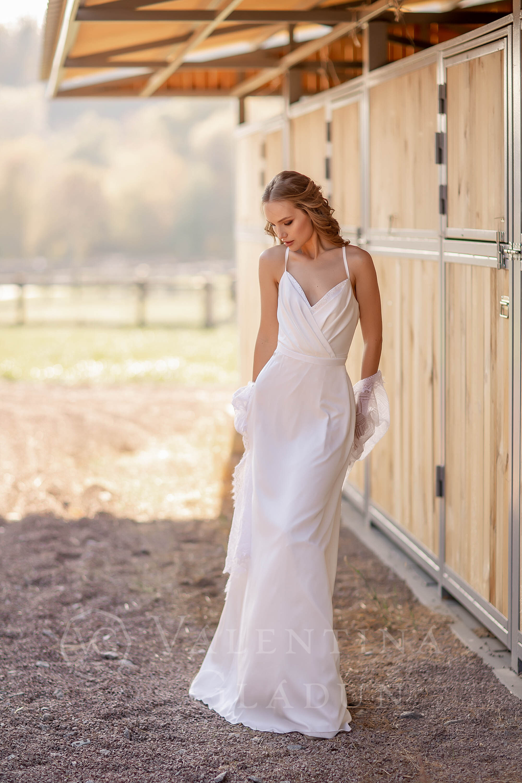 Шелковое вечернее свадебное платье на тонких бретелях и с открытой спинкой. Линия декольте украшена мерцающим декором.