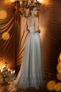 Лиф выполнен из стреч-сетки и украшен французским кружевом, расшитым бисером. Юбка изготовлена из шелка «Армани» и ефро-фатина. Пояс с вышивкой бисером. По спинке застежка «молния», воздушные петли и ряд пуговиц. Данное платье подойдет для выпускного бала или корпоратива.