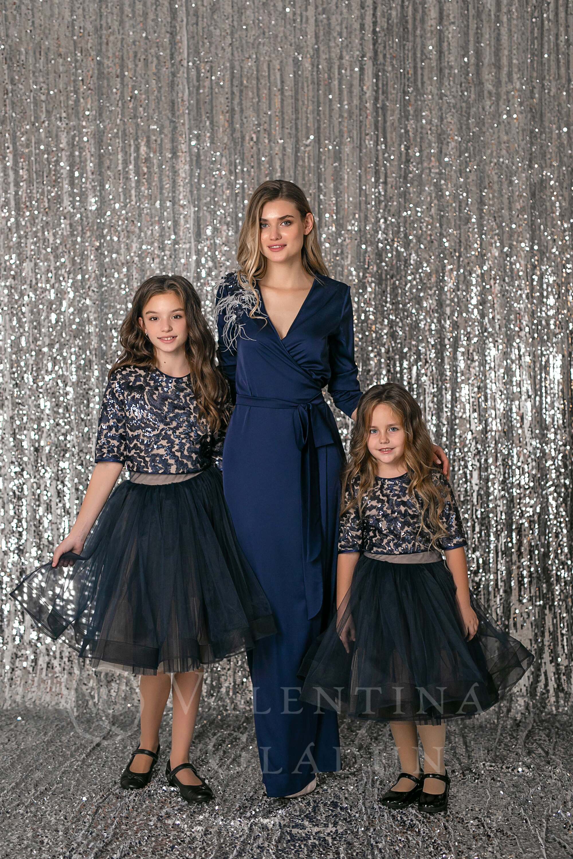 Модное вечернее платье с запахом в пол Кампари с длинным рукавом выполнено из нежного шелка "Армани" темно-синего цвета. V-образный вырез впереди, мягкий тонкий пояс на талии. Одно плечо украшено элементами французского кружева с расшивкой ручной работы из бисера и бусин с элементами перьев.