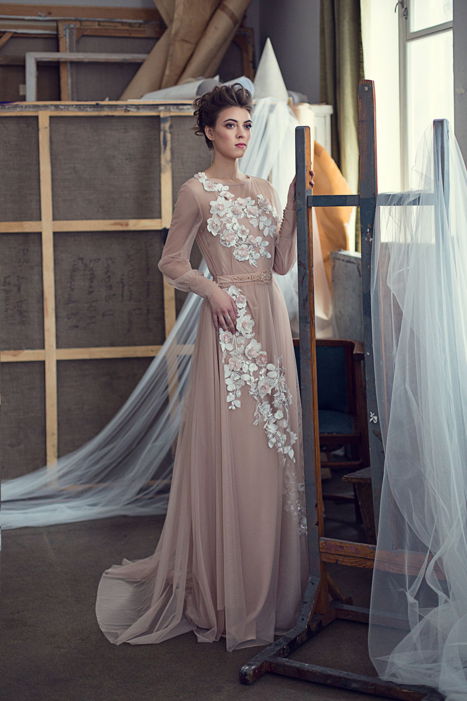 Украшают модель элементы 3D гипюра и обьемные цветы. Нежная вышивка на поясе.