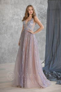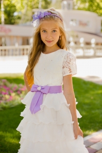 Короткое и одновременно длинное платье изготовлено из атласа и шифона. Корсет задрапирпован нежным фатином хаялом в двух цветах. Линию декольте украшаетвышивка бисером и пайетками,придающая легкое мерцание. Полосы разного цвета словно серпантином переходят от корсета в юбку. За счет прозрачности фатина хаял, платье сексуально приоткрывает ноги. Корсет укреплен риглином(корсетная фурнитура), бюстье и фиксирующей резинкой под грудью. Застежка молния и шнуровка по спинке. Модель изготовлена в цветах айвори и бордо.