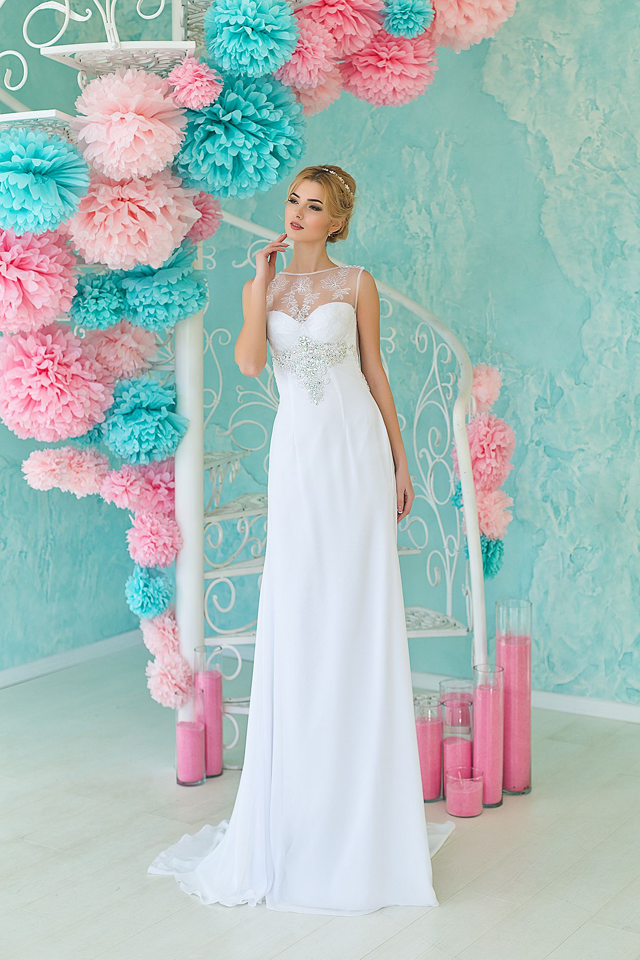 Линию под грудью и переход от прозрачной спины к юбке украшает вышивка бисером и стразами Swarovsky.