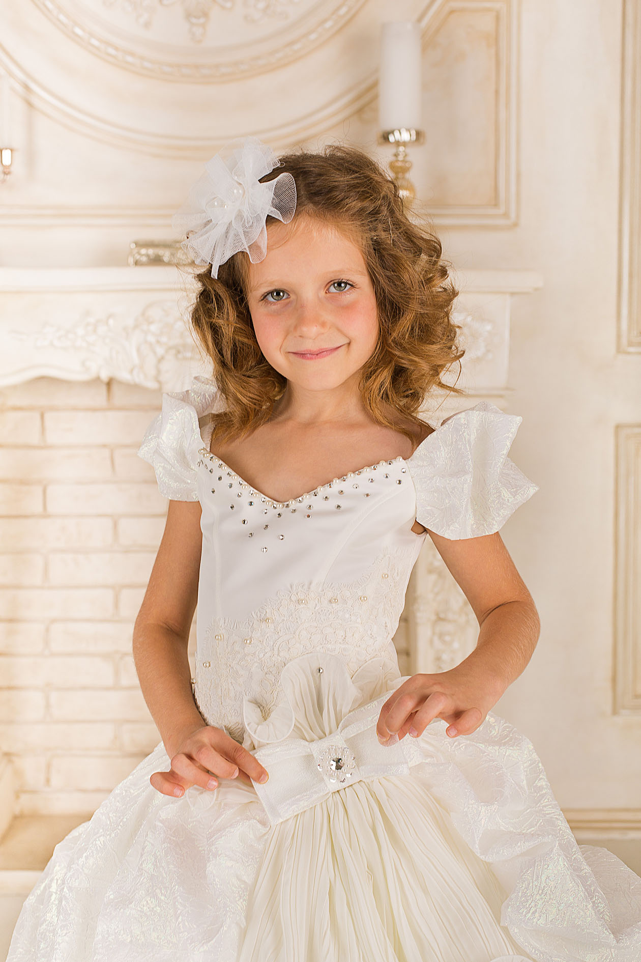 Нарядное королевское детское платье выполнено из сатина. Эффектная юбка драпирована золотой парчей и кристалином. Вышивка жемчугом и стразами Swarovski по корсету. Застежка "молния" и фиксирующая шнуровка.