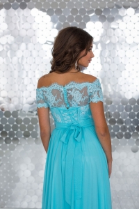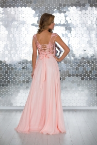 Платье А-силуэта изготовлено из шифона и атласа.Модель выполнена по новейшим технологиям изготовления корсетных изделий с бюстье и фиксирующей резинкой под грудью. Мелкую драпировку по лифу украшает вышивка бисером и стразами Swatovsky, переходящая на плечи. Летящая юбка в обработке солье дополняет образ. Застежка молния и шнуровка по спинке.