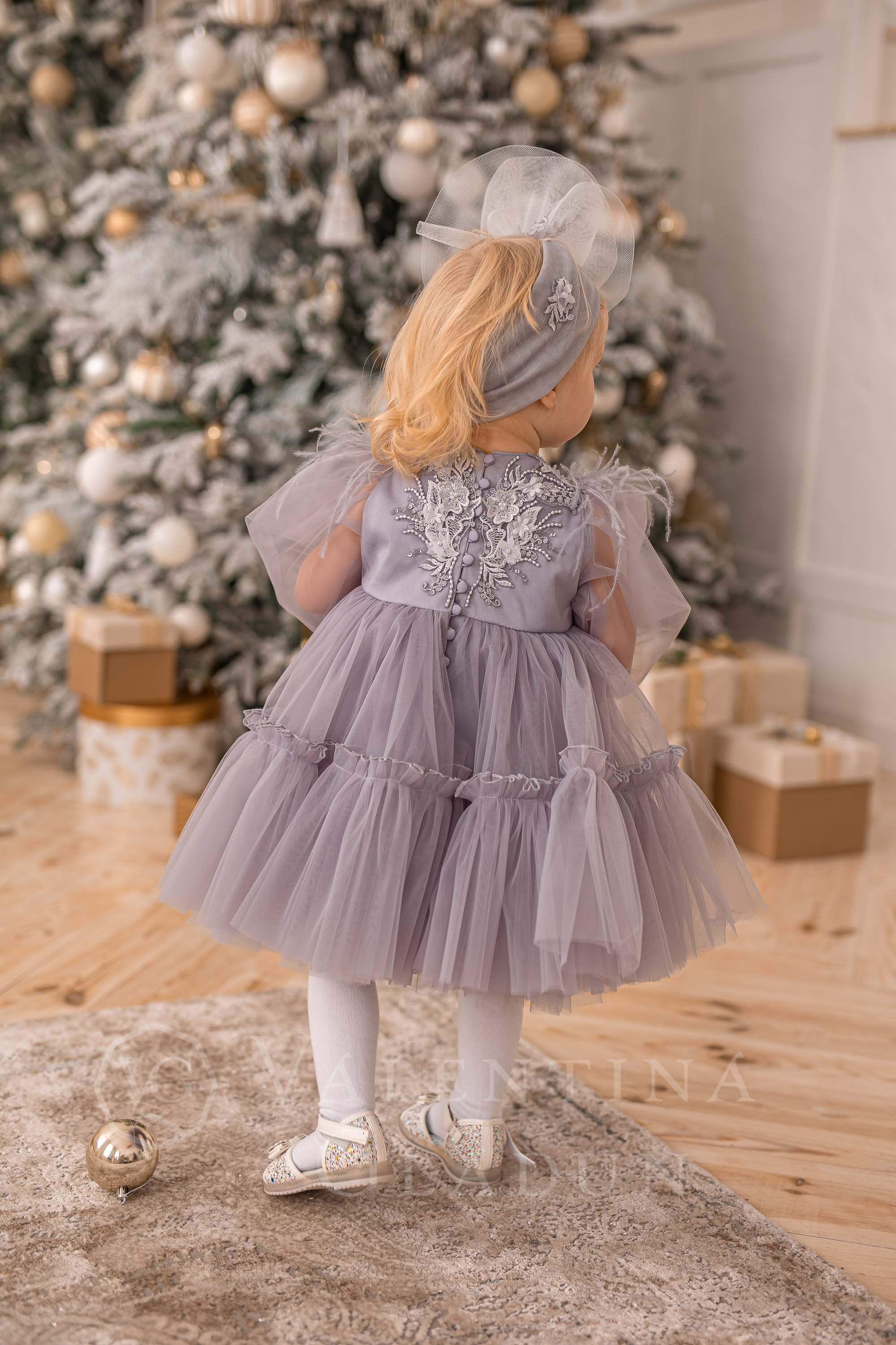 Нарядное детское вечернее платье серого цвета. Верх украшен расшитым кружевом и перьями контрастного цвета. Многослойная фатиновая юбка и широкие рукава дополнены горизонтальными рюшами. Моделька платья короткая с нарядным лифом и воздушной юбочкой будет идеально смотреться на памятной фотосессии, утреннике в саду, на дне рождения, а также на абсолютно любом торжественном мероприятии.