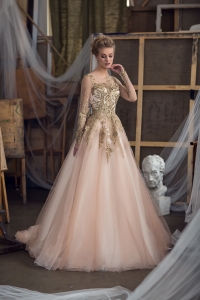 Корсет, плечи, рукава и переход на юбку украшает сутажный французский 3D гипюр с золотой нитью и обьемными цветами. Длинные рукава с застежкой на запястье на пуговицы. Золотой цвет гипюра может сочетаться с большим колличеством оттенков, поэтому платье может быть и в лазурном, небесном и марсаловом оттенках.