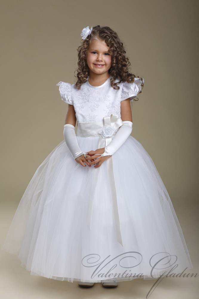 Пышное нарядное платье для девочки. Изготовлено из сатина и евро-фатина.Топ платья украшает французское сутажное кружево. Данная модель выполнена в цвете айвори.