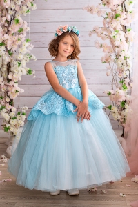 Шикарное пышное детское платье изготовлено из атласа и фатина хаял. Корсет украшает элементы расшитого гипюра. Оригинальная баска на юбке делает модель более эффектной. Застежка молния и шнуровка по спинке.