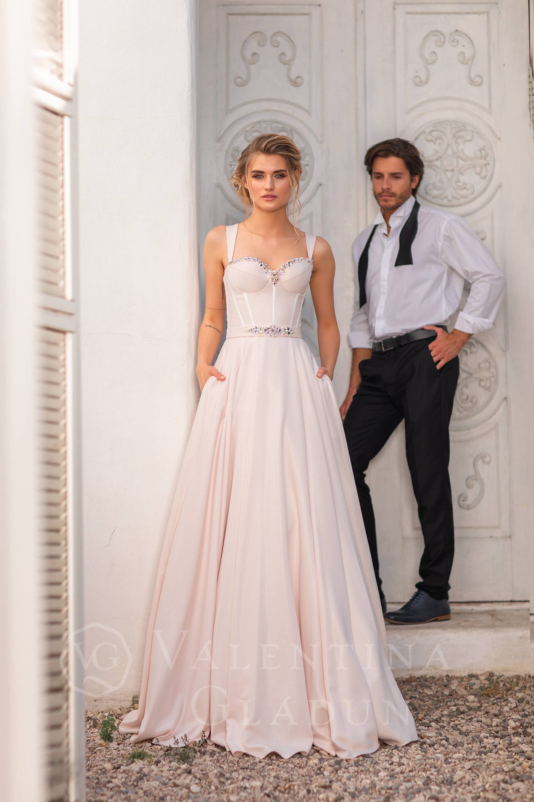 Пышное свадебное платье А-силуэта Фрагола изготовлено из мерцающего сатина. Бельевой корсет (бюстье) на тонких бретелях декорирован вышивкой ручной работы из жемчужин, хрусталя, бусин и крупных кристаллов. Юбка пышная в пол с красивыми складами по линии талии. Дополняет модель – пояс, расшитый вручную жемчужинами, хрусталем, бусинами и крупными кристаллами.