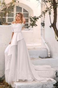 Оригинальное свадебное платье с длинным рукавом выполнено из мерцающего льна и евро-фатина. Корсет со встроенным бюстье покрыт тонким гипюром, расшитым пайеткой. Декольте украшено вышивкой ручной работы из 3D-элементов кружева, жемчужин и кристаллов. Юбка пышная с асимметричным воланом. Свадебное платье со шлейфом. Дополняет модель – тонкий пояс, украшенный объемным узором расшивки из жемчужин, пайетки и крупных кристаллов.