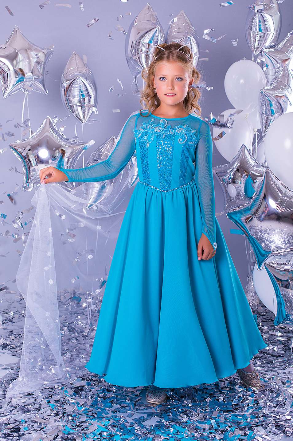 Сказочное платье Эльзы. Изготовлено из шифона и сатина. Корсет украшают вставки пайеточной ткани ,вышивка бисером и стразами Swarovski. Прозрачная "ледяная" мантия дополняет образ сказочной принцессы. Застежка "молния" по спинке.