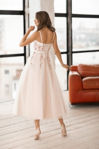 Пышное легкое коктейльное платье с глубоким декольте выполнено из мерцающего стрейч-сатина и евро-фатина. Лиф на тонких бретелях с фигурным отворотом укреплен риглином и покрыт евро-фатином. Оригинальный узор вышивки «шелковая гладь», расшитый крупными кристаллами, украшает лиф и спускается на юбку. Юбка пышная, длинa -- 3/4. Пояс подчеркивает линию талии. Застежка – потайная молния по юбке и шнуровка по спинке.