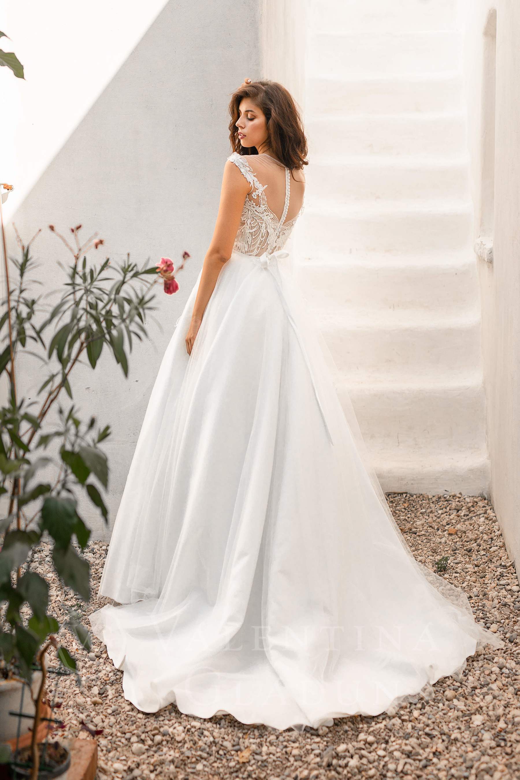 Легкое свадебное платье А-силуэт выполнено из королевского атласа и евро-фатина. Прозрачный корсет расшит вручную узором и 3D-элементами кружев, которые украшены жемчужинами и хрустальными бусинами вышивка спускается по юбке. Дополняет модель тонкий пояс с вышивкой ручной. Свадебное платье со шлейфом.