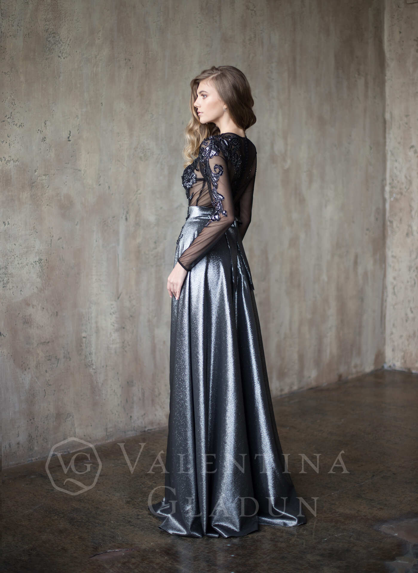 Дизайнерское вечернее платье А-силуэта. Лиф из стрейч сетки черного цвета с длинными рукавами украшен авторской машинной вышивкой и дополнительно расшит бисером, жемчугом, пайеткой и камнями, по спинке ряд пуговиц. Юбка из серебряной парчи с высоким разрезом по ноге.