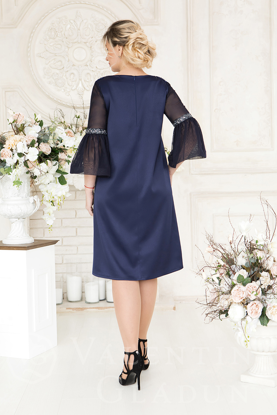 Вечернее платье прямого силуэта изготовлено из стрейч-сатина. Элементы французского сутажного кружева, расшитого жемчугом и пайетками, урашают зону декольте и частично рукава. Застежка "молния". Подойдет для мамы жениха или невесты, а также прекрасный вариант для выпускного вечера.