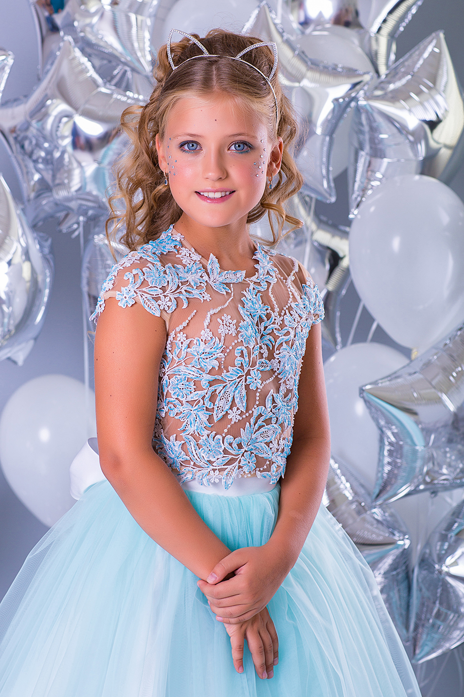 Топ и юбка изготовлены из стрейч-сетки и евро-фатина. Топ украшают аппликации сутажного французского кружева, расшитые бисером и пайетками. Многослойная пышная юбка из евро-фатина с небольшим шлейфом. Застежка «молния» по юбке и пуговицы по спинке топа.