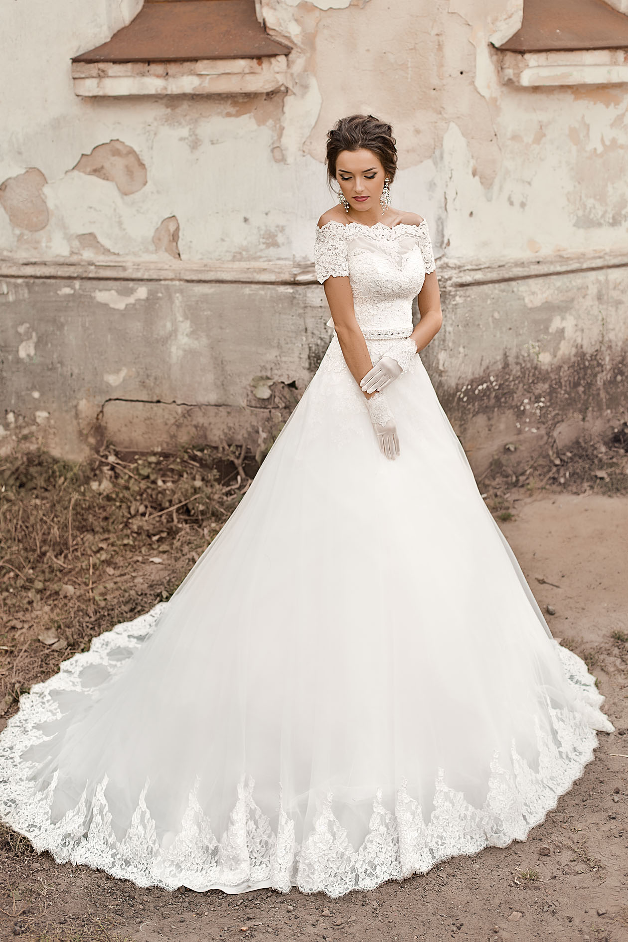 Нежное свадебное платье А-силуэта изготовлено из сатина и фатина хаял.