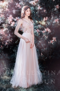 Легкое платье оттенка пудры А-силуэта изготовлено из шелка и евро-фатина. Прозрачный бельевой корсет с встроенным бюстье украшают французские сутажные аппликации расшитые бисером в цвет платья. Нежная юбка из шелка и евро-фатина. Застежка "молния" и пуговицы по спинке.
