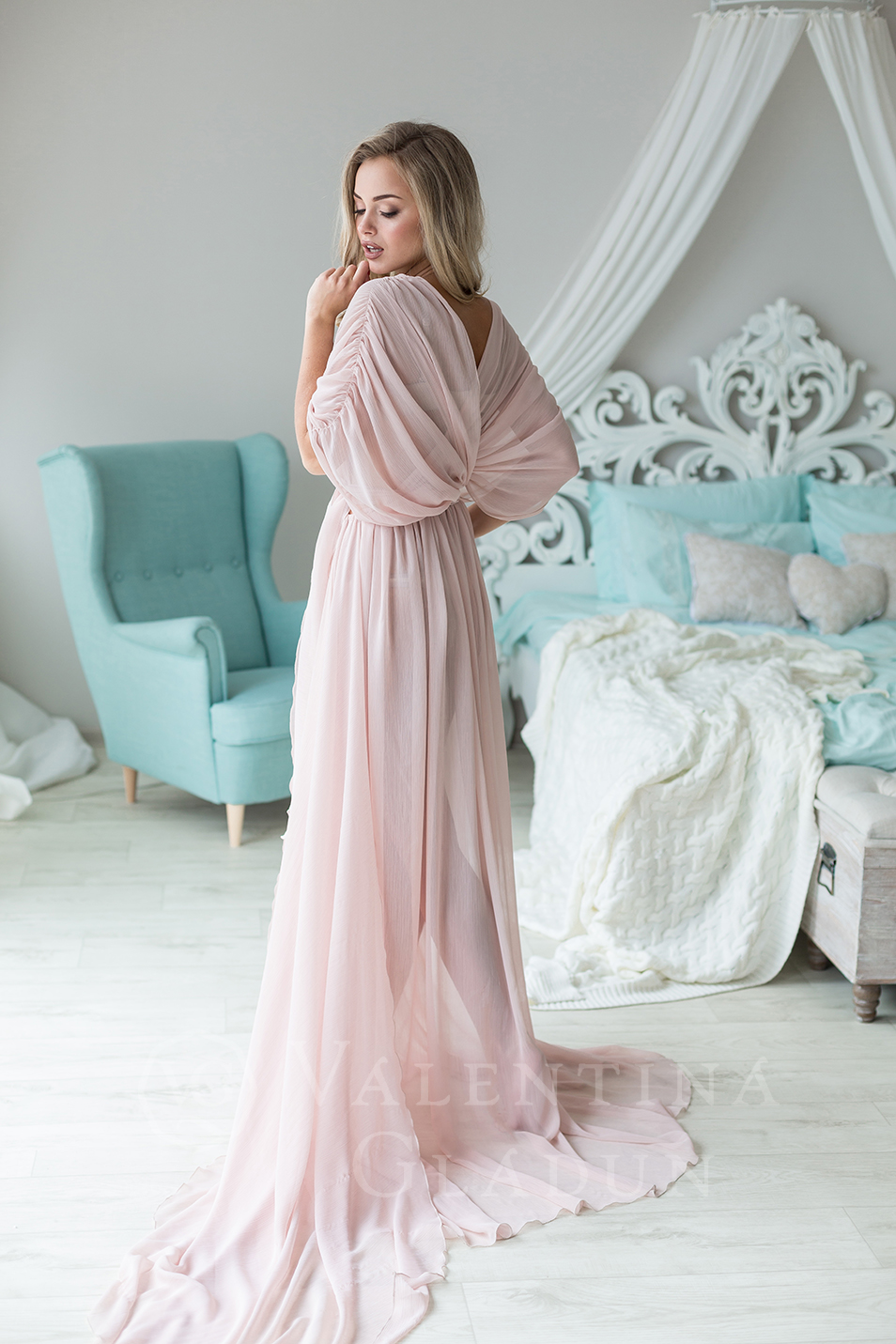 Будуарное платье из шифона для утра невесты. Тонкая ткань такого утреннего наряда придаст образу легкости и воздушности. Необычный крой открывает плечи. Фиксируется поясом на запах.