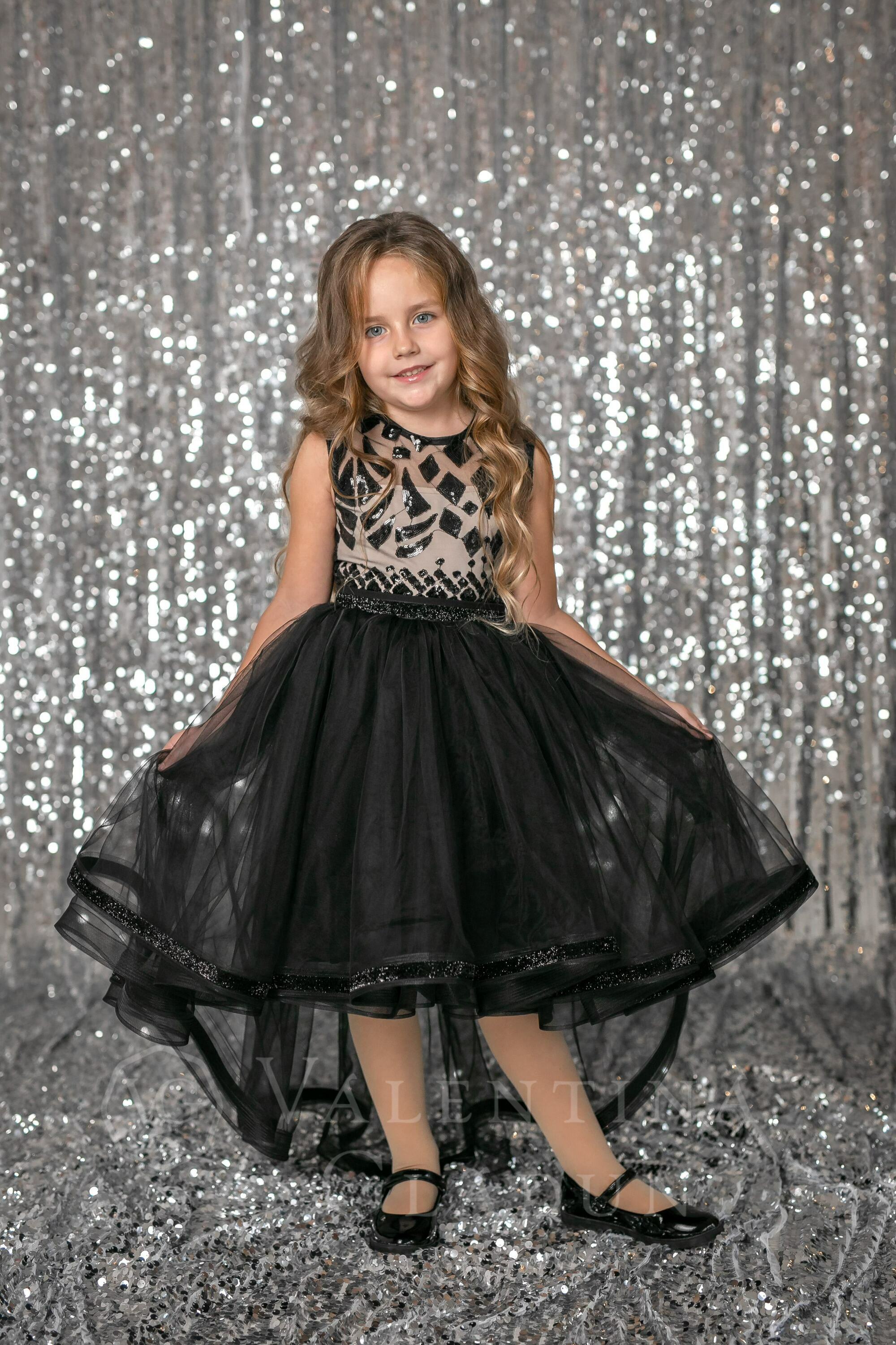 Нарядное элегантное платье Винчензо без рукавов с пышной юбкой. Мягкий лиф с круглым вырезом горловины изготовлен из сатина и покрыт тканью в пайетку. Юбка с перепадом длины и драпировкой по линии талии выполнена из легкого евро-фатина. Край юбки в данной моделе украшает блестящая жесткая лента, образуя красивые воланы. Застежка – потайная молния по юбке и спинке, пуговичка на спинке. Линию талии подчеркивает блестящая жесткая лента на тонком поясе, который завязывается сзади в элегантный бантик.