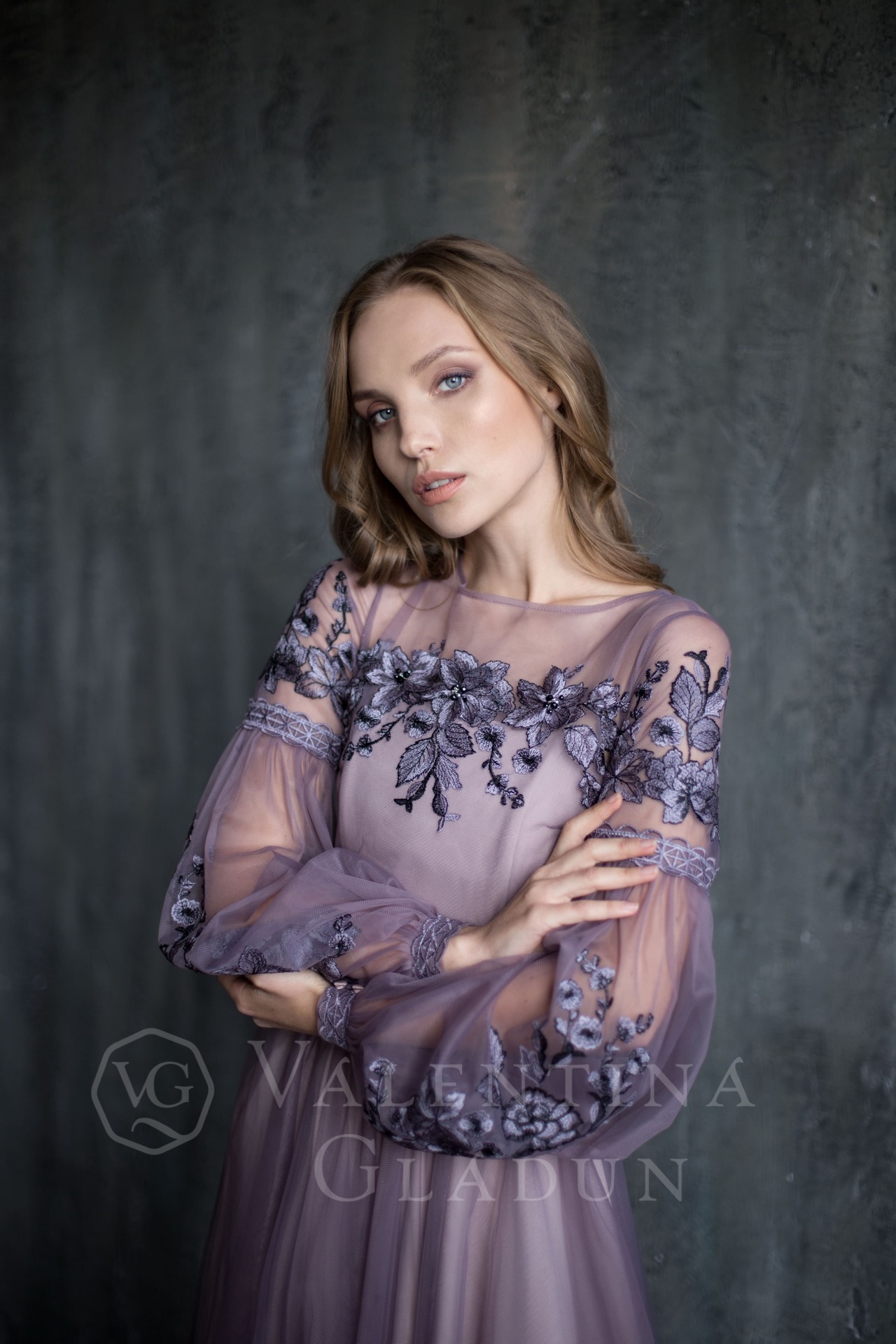 Пышное, легкое платье в стиле Бохо с высоким разрезом по ноге, изготовлено из евро-фатина. Воздушные рукава и верх лифа украшены дизайнерской машинной вышивкой с 3d цветами и прошвой с геометрическим рисунком. Данное платье выполнено в дымчато – аметистовом цвете.